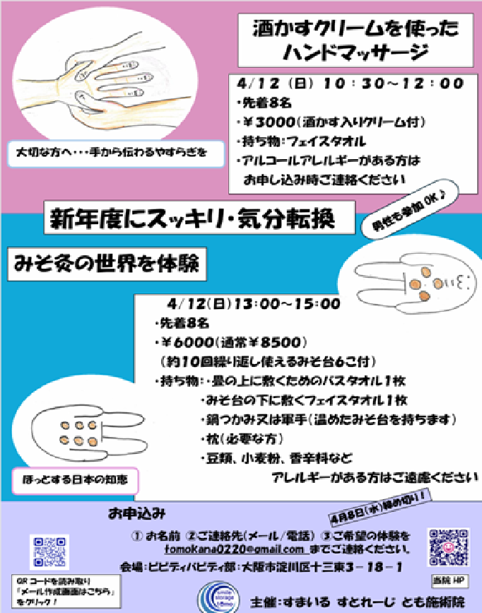 4月12日(日)に淀川区のビビディバビディ部さまの場所をお借りして「酒かすクリームを使ったハンドマッサージ」と「みそ灸」の体験会を開催します!